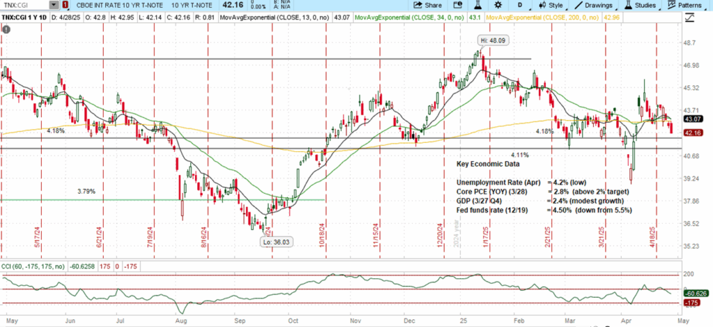 Published 4/29/25 – Yesterday, the 10-year Treasury rate fell sharply, taking it once again into the area of long-standing support (see the chart below). There has been little fanfare about the move in rates indicating that big bond traders may know something that is not being published. In any event, the 10-year Treasury rate has fallen from the April 11 closing high of 4.49% to the close yesterday at 4.22%, nearly a drop of 30 basis points (.3%).
